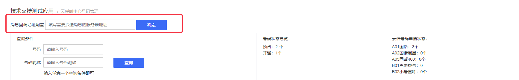 - 登录云信控制台在选择开通云呼叫中心的应用,在云呼叫中心功能栏选择“号码管理”,在“消息回调地址配置”填写需要抄送消息的服务器地址